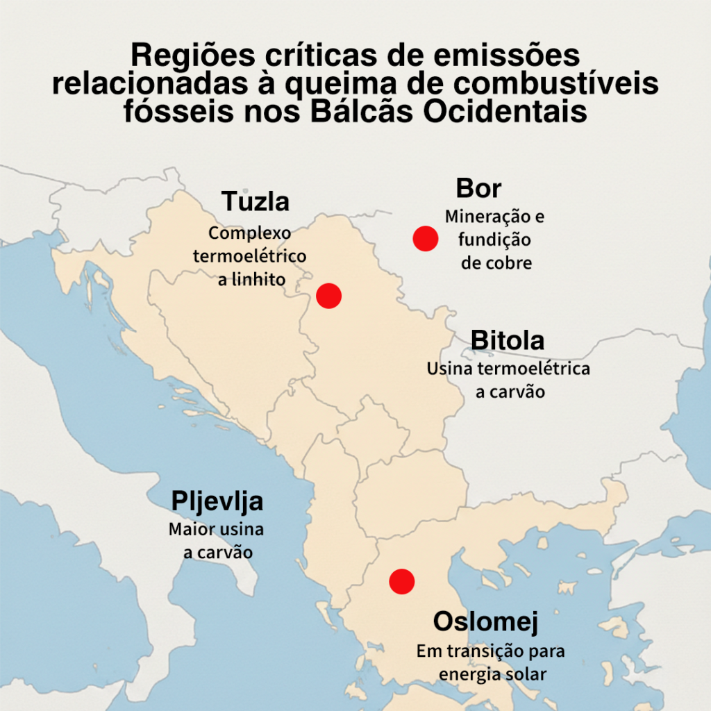 De acordo com a Agência Europeia do Ambiente, seis das dez centrais elétricas mais poluentes da Europa estão localizadas nos Bálcãs Ocidentais, emitindo mais dióxido de enxofre do que todas as usinas a carvão da União Europeia (UE) juntas. Na Macedônia do Norte, a origem de cerca de 45% da eletricidade ainda é o carvão, enquanto na Sérvia esse índice ultrapassa os 65%.