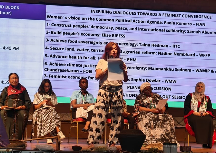 Women and girls in rural areas, poor urban areas, women of colour, migrant women, marginalized class or oppressed caste, including indigenous women, are affected disproportionally. We stand in strong solidarity with the women of Sudan, Congo, Palestine, and others living through war zones, who continue to resist violence and genocide. This violence undermines women’s right to health and also our ability to participate in food sovereignty movements, as survival and safety become constant struggles.