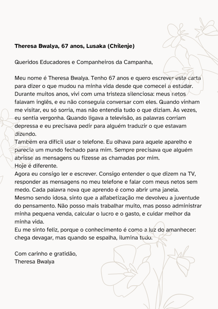 Abaixo coloco as duas cartas que mais me emocionaram e que se tornaram combustível nesta caminhada. Uma veio das mãos ásperas e envelhecidas de uma idosa que reencontrou, entre palavras simples, o poder de dialogar com o mundo; a outra, de uma mulher jovem, que enfrenta o estigma da exclusão por ser albina, que escreveu pela primeira vez o seu próprio nome com a firmeza de quem descobre que a escrita também pode ser um espelho.