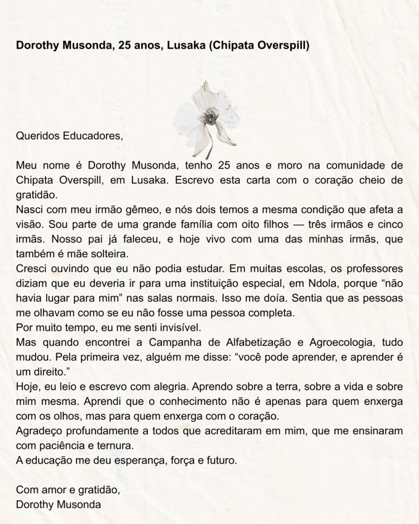 Assim como Amílcar Cabral escrevia a Paulo Freire, afirmando que a educação deve nascer das entranhas do povo e devolver ao camponês a dignidade roubada pela colonização, também aqui a campanha se faz semente. No chão dos vilajeros e bairros, a alfabetização se transforma em ato de resistência, reafirmando que o futuro da Zâmbia só pode ser construído com raízes firmes em sua própria história, cultura e capacidade de reinventar-se.