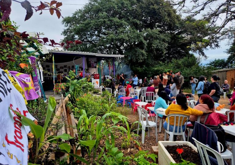Pendant cette période, nous avons créé un espace de solidarité, de lutte et d’auto-organisation des femmes qui perdaient leur emploi et vivaient l’incertitude du moment. Avec l’aggravation de la faim, nous avons occupé un terrain abandonné, utilisé comme dépotoir, pour transformer cet espace, planter de la nourriture et organiser les femmes du territoire. Depuis lors, en 2020, nous avons consolidé cet espace de lutte appelé Collectif périphérie féministe [Coletivo Periferia Feminista], une articulation de la Marche Mondiale des Femmes et des Amis de la Terre Brésil, qui se renforce de plus en plus.